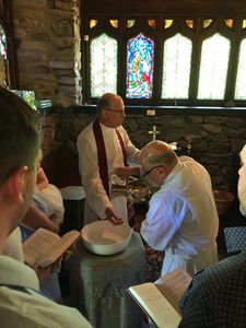 As Eucharist Minister Michael Smyser pours water into the basin over Fr. Gahan's hand, Holy Scripture is read blessing the water to be used for baptizing God’s children into Christ' Church.